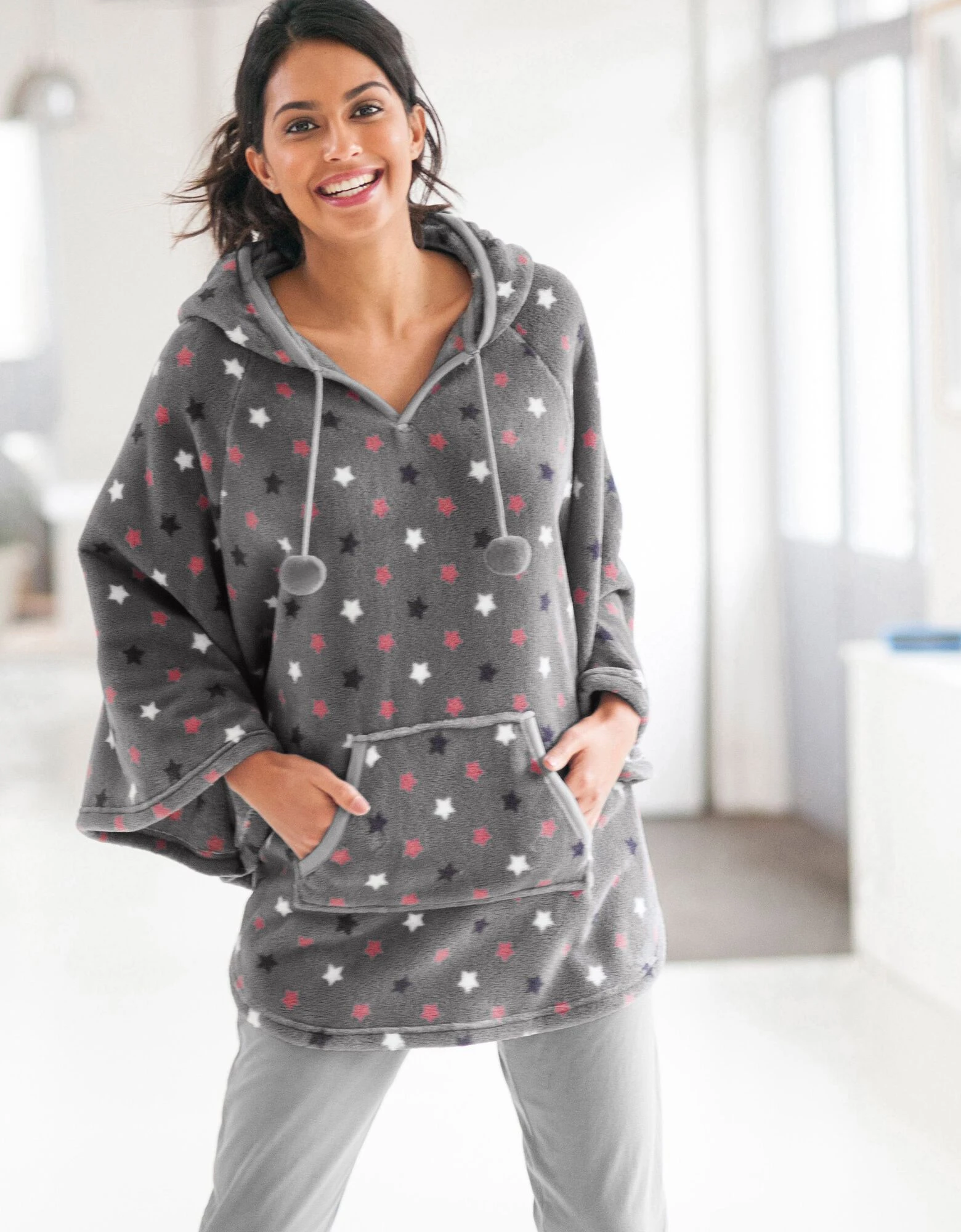 – Capuche et liens terminés par des pompons devant